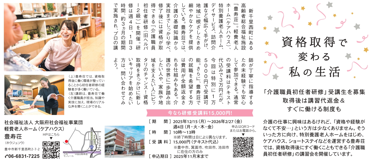 City Life 北摂WEST 11月号に掲載されています。小さなお子さんがいても、幼稚園や学校に通っている時間で資格取得が可能です。仕事の為、将来の家族の介護の為、スキルアップの為等、色々な目標に向かって皆さん学んでおられます。年度内最後の開校となります。令和8年度から介護の仕事を考えられている方せひ!!!